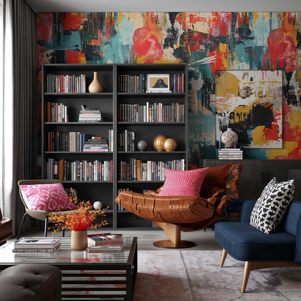 Who says bookshelves need traditional backgrounds? Modern abstract wallpaper turns your reading nook into a contemporary art gallery. Think bold brushstrokes, color blocks, or fluid patterns that make your books look like they’re floating in front of a masterpiece.
