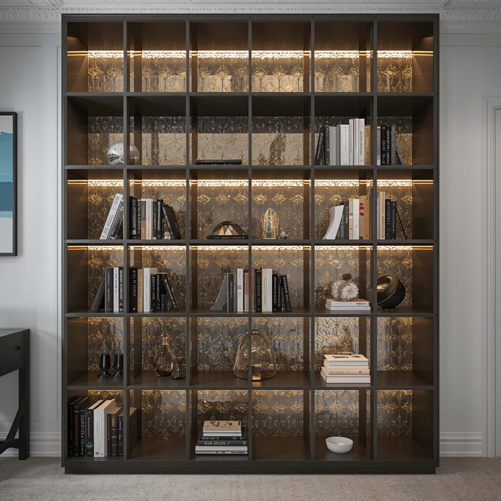 Book organization becomes extra important with reflective backgrounds. Color-coordinate or size-organize your books to create clean lines that complement rather than compete with the shimmer.