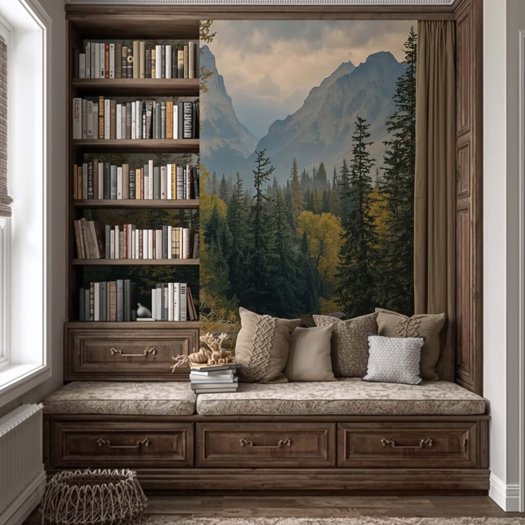 The magic of scenic wallpaper lies in its ability to create perceived depth. Arrange books to frame rather than block key visual elements.