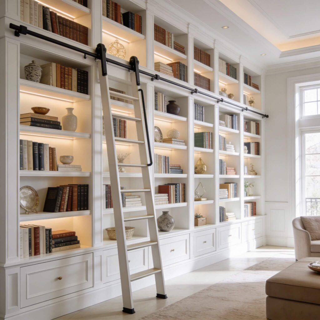 Here’s a pro tip: add personal artifacts like framed vintage postcards or old family photos. Real libraries accumulate personality over time – yours should too.