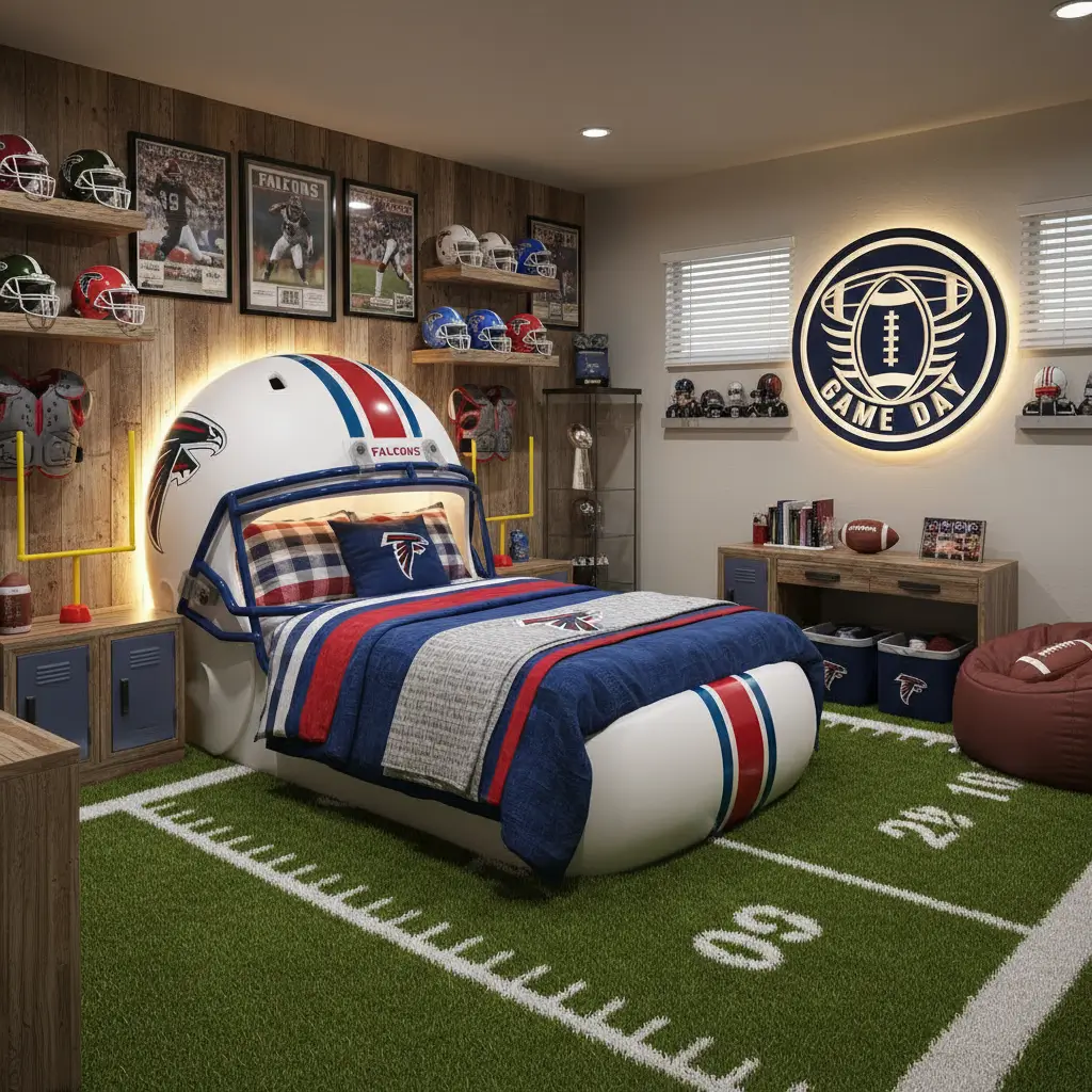 Football bedrooms walk the line between team spirit and overwhelming. The gridiron aesthetic works best when you embrace the tactical, strategic side of football rather than just plastering team logos. My nephew plays varsity football, so we designed his room to feel like a player’s personal film room meets locker space.