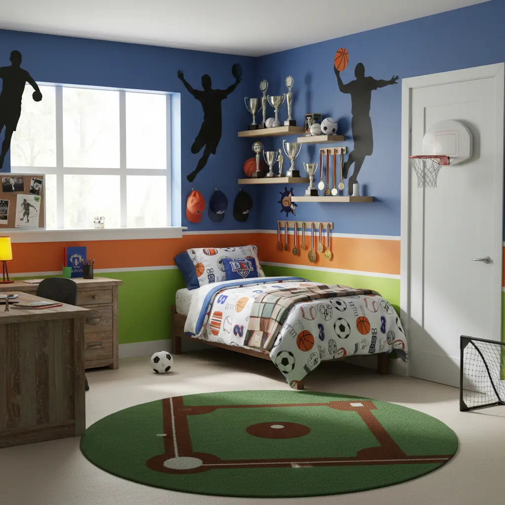 These rooms need to celebrate athletic dedication without looking like you raided a sports store’s clearance section and threw everything at the walls.
