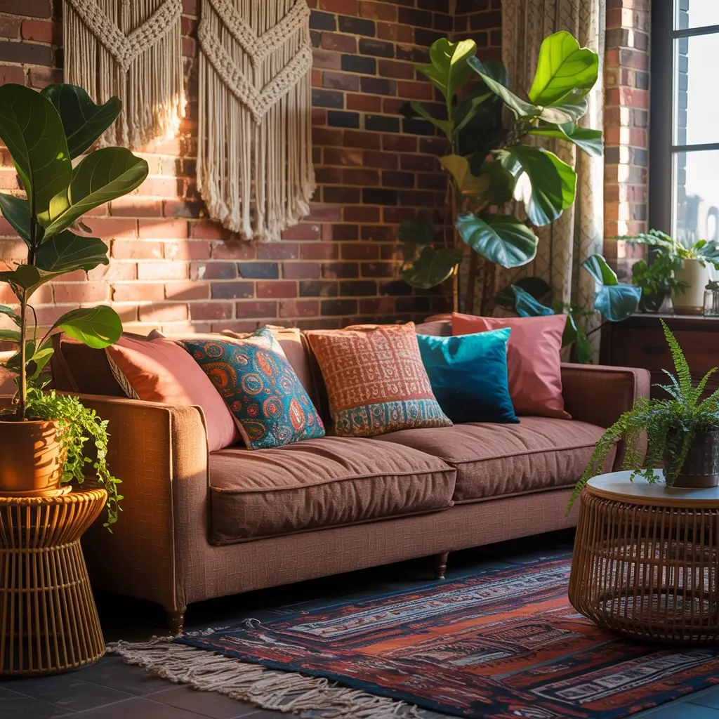 Boho style can easily tip into “thrift store explosion” territory. A solid brown couch acts as the visual anchor that makes everything else look intentional rather than accidental.