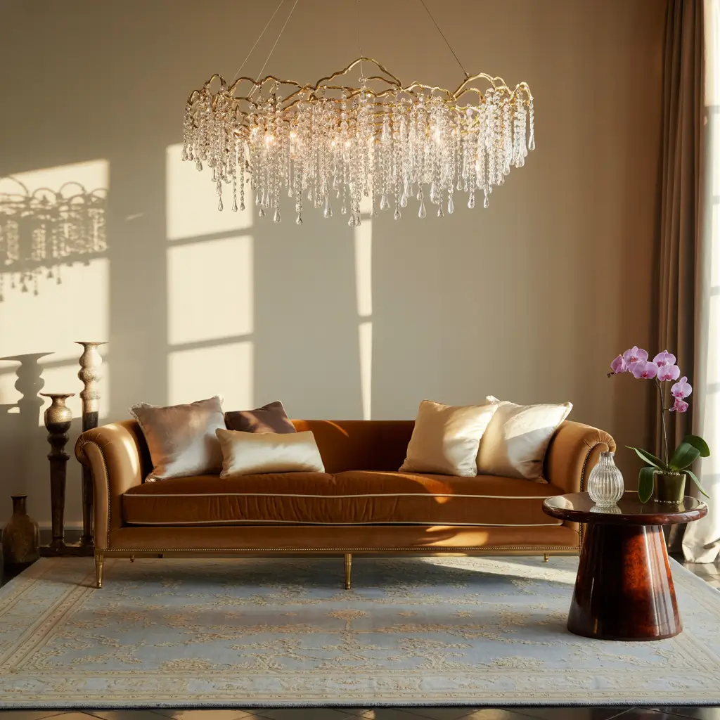 Statement lighting above brown couches creates focal points that elevate entire rooms. This approach uses dramatic fixtures to transform brown furniture from basic to breathtaking.