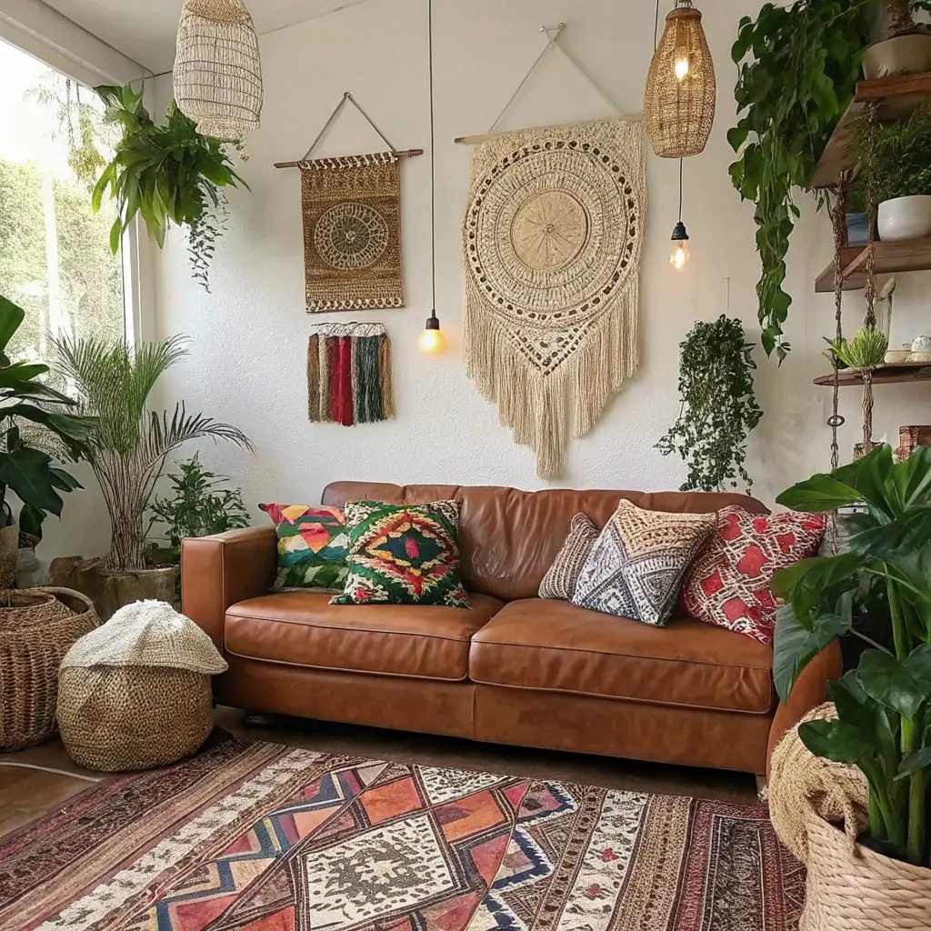 The combination works because bohemian style needs grounding elements to prevent chaos. Your leather couch provides that anchor while still bringing natural, organic qualities that bohemian style celebrates.