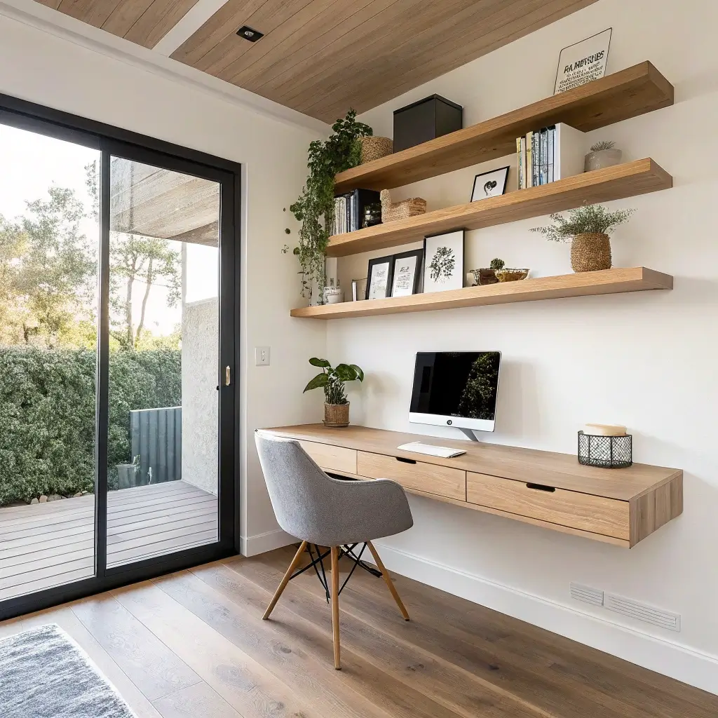 Modern floating desks with geometric shelving turn your workspace into functional art. I installed hexagon and triangle shelves above my floating desk, and my home office became the room guests actually want to see. The bold shapes create visual interest that makes working feel less mundane.