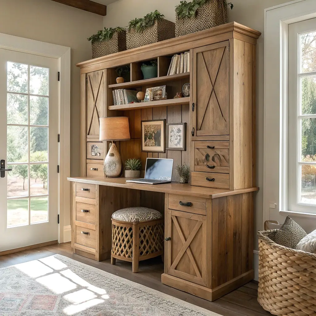 Rustic wood built-ins bring soul to home offices that might otherwise feel cold and corporate. I built mine from reclaimed barn wood, and now my home office feels like a cozy library instead of a beige cubicle I escaped from downtown. The wood grain alone makes me happy every morning.