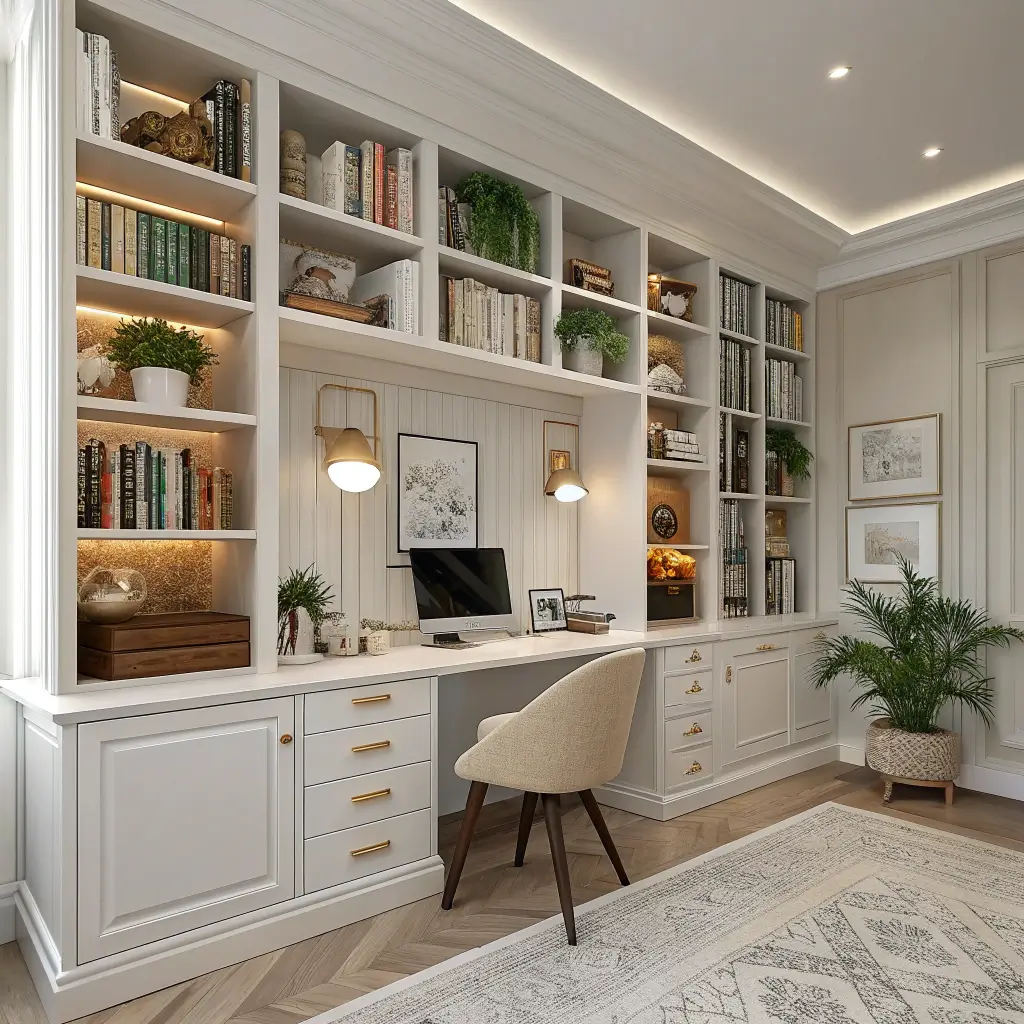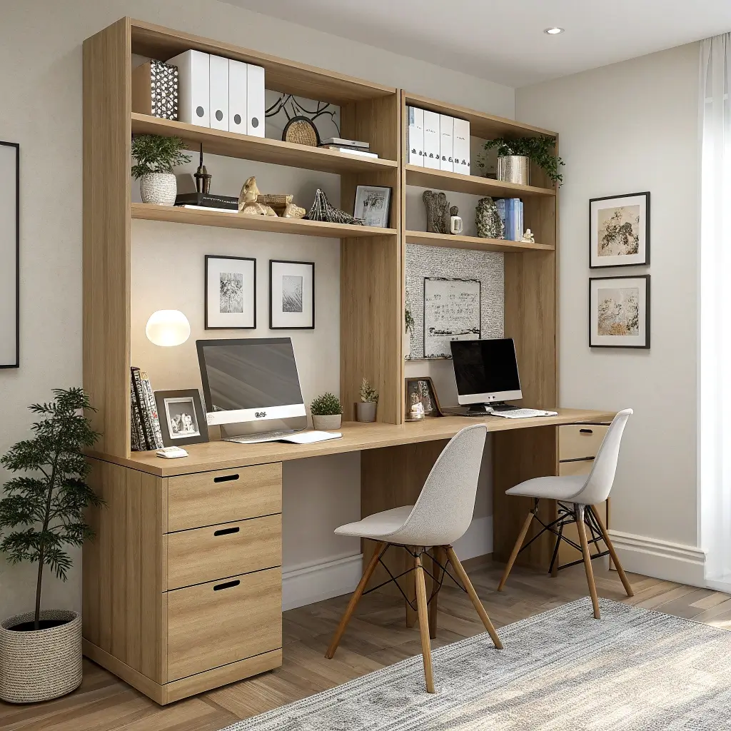 Dual workspace built-ins solve the modern problem of two people working from home without doubling your office space. My partner and I share a dual-desk setup with vertical dividing shelves, and it saved our relationship during peak work-from-home chaos. We both have dedicated workspace without needing separate offices.