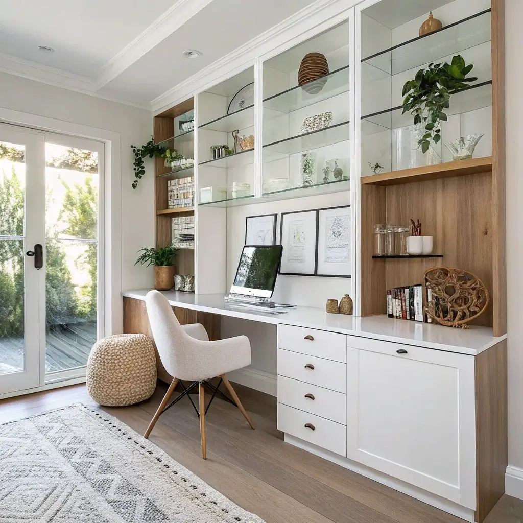 Built-in desks with glass display shelves create upscale home offices that impress clients and colleagues during video calls. My glass shelf setup displays awards, certifications, and carefully chosen decorative items that make my background look intentional and professional.