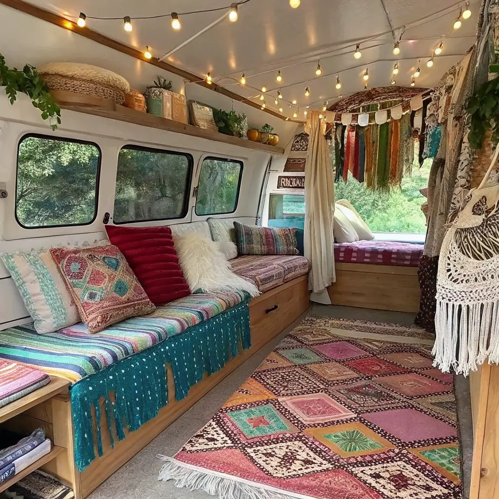 Boho chic camper transformations embrace maximalist creativity within minimal space – proving that tiny homes can handle bold personality. This style welcomes patterns, textures, colors, and collected treasures from your travels.