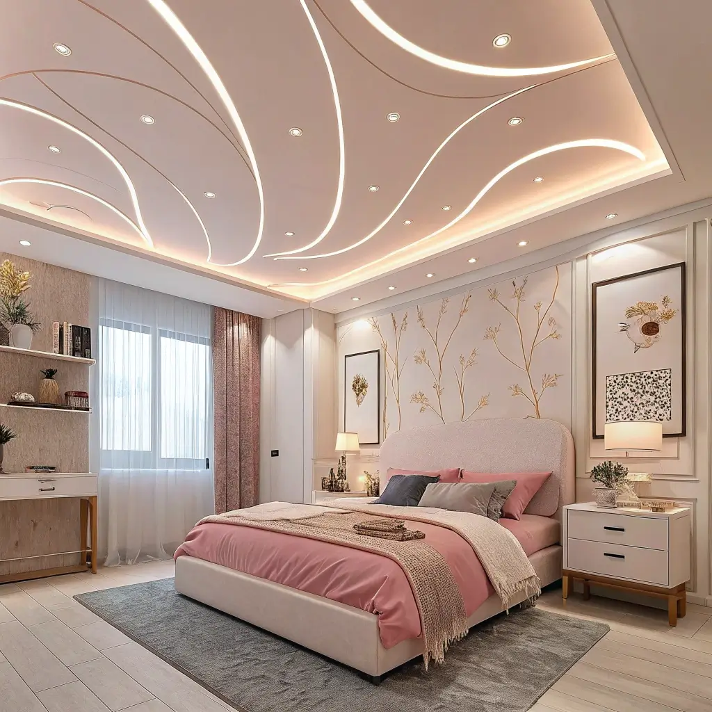 Straight lines and sharp angles create energy and focus. Great for offices, not ideal for bedrooms. Curves, on the other hand, feel soft, organic, and calming. My sister’s ceiling has gentle wave-like curves flowing from the entry wall toward the bed, creating subtle movement without being distracting.