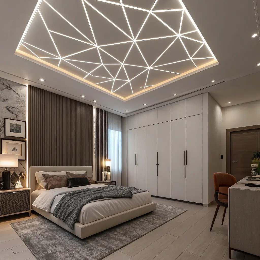 Geometric false ceilings create contemporary edge perfect for modern bedrooms. My friend’s architect designed a geometric pattern with offset rectangles, and while I was skeptical during construction, the finished ceiling is absolutely stunning—like living under modern art.