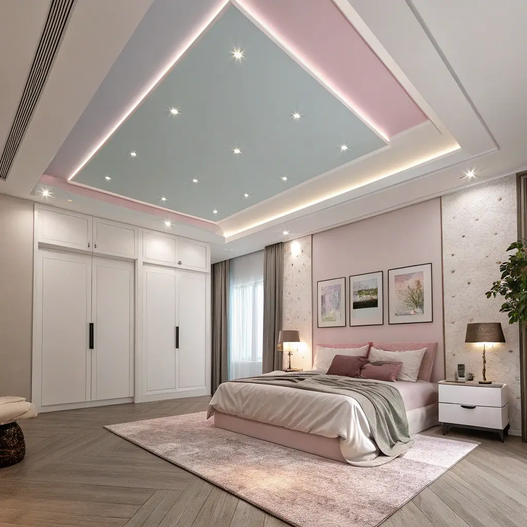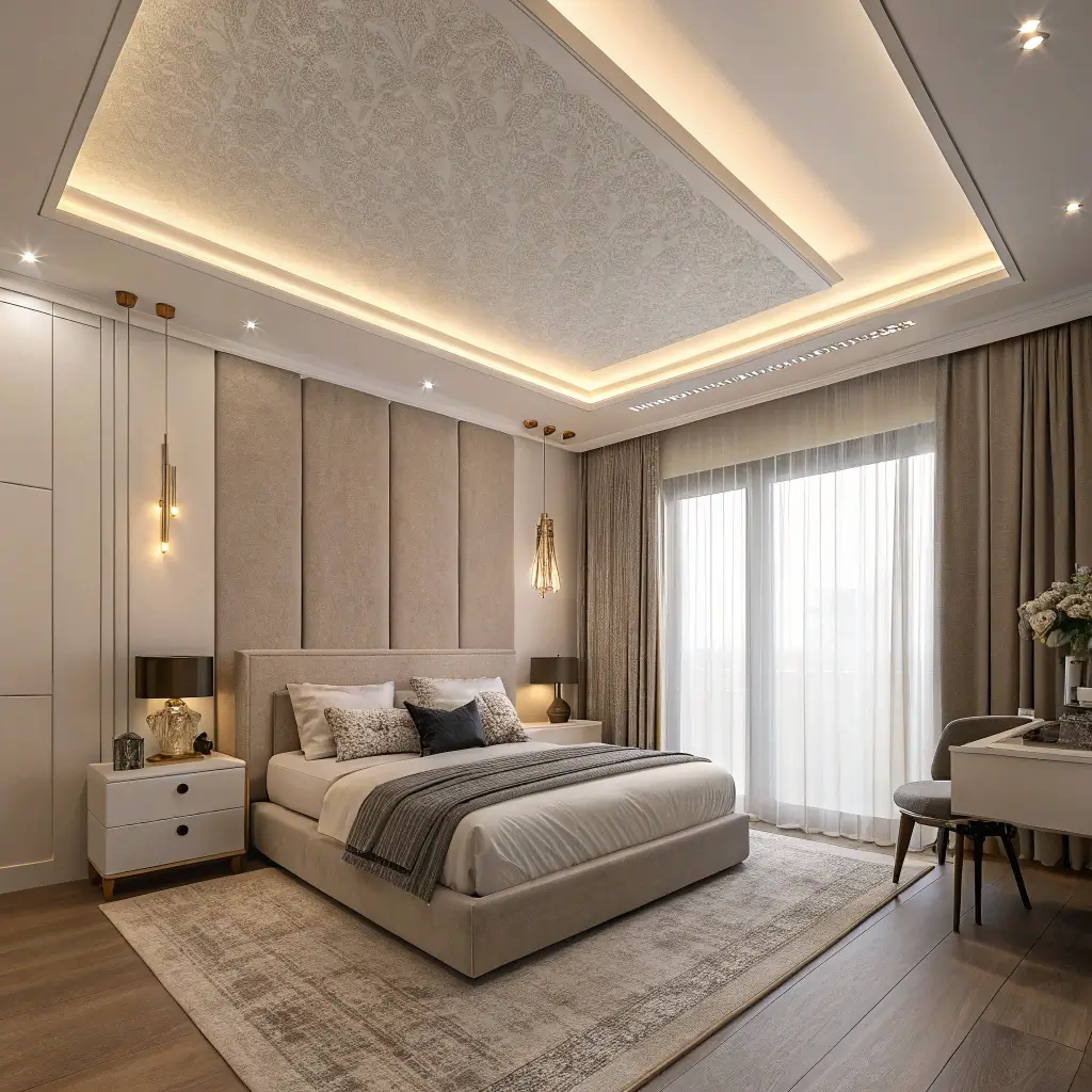 Layered gypsum ceilings create depth through multiple levels. I designed my guest bedroom with a three-layer gypsum ceiling, and the cascading levels add this architectural interest that makes the room feel more expensive and thoughtfully designed.