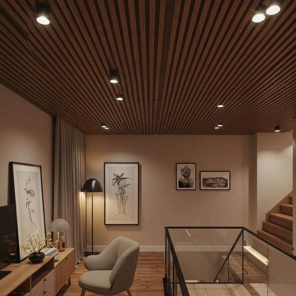 Wooden slats bring warmth to modern design without sacrificing clean lines. I installed parallel oak slats in my bedroom, and the natural wood grain adds texture and coziness that painted ceilings could never achieve. Plus, the acoustic benefits are real – my room went from echo chamber to recording studio quality.