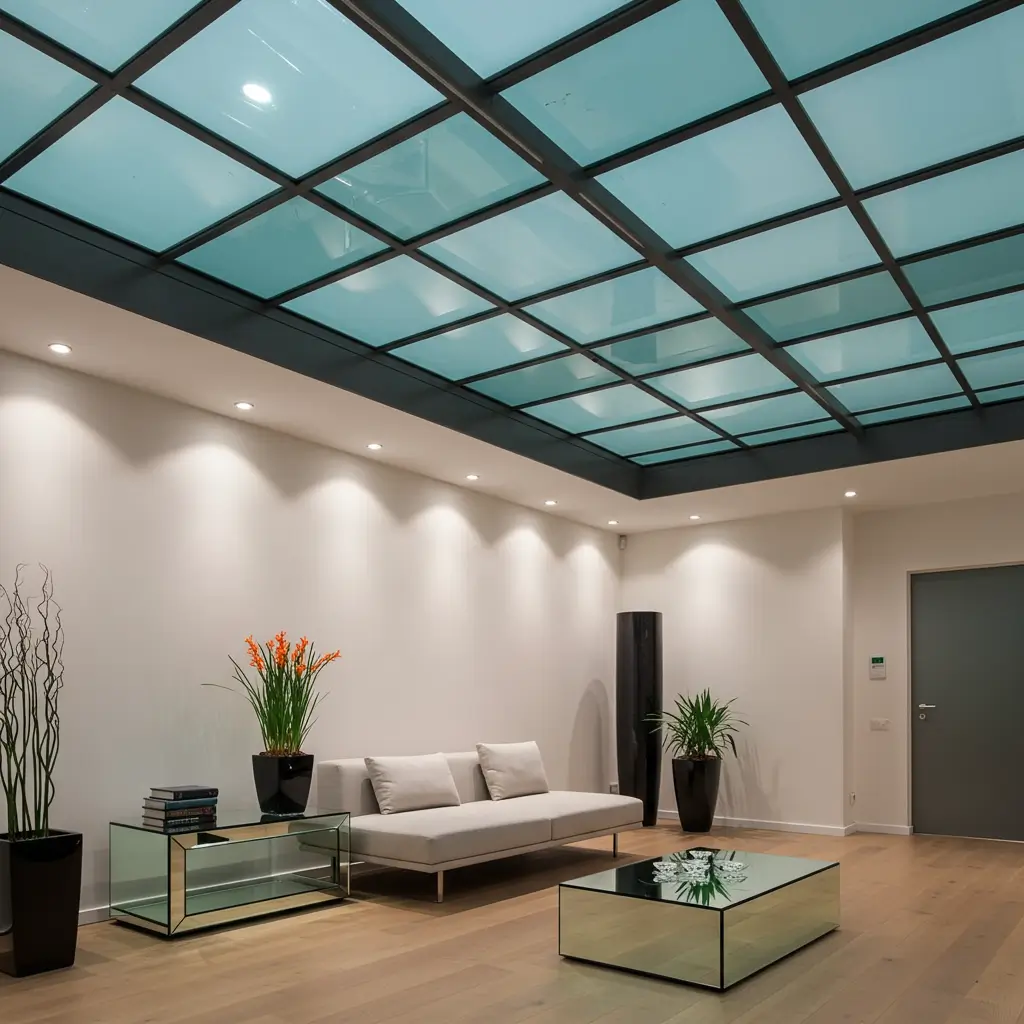 Glass panel ceilings create luminous surfaces that feel both modern and ethereal. I installed frosted glass panels with color-changing LEDs above them in my bathroom, and now every shower feels like a spa experience. The diffused light eliminates harsh shadows completely.