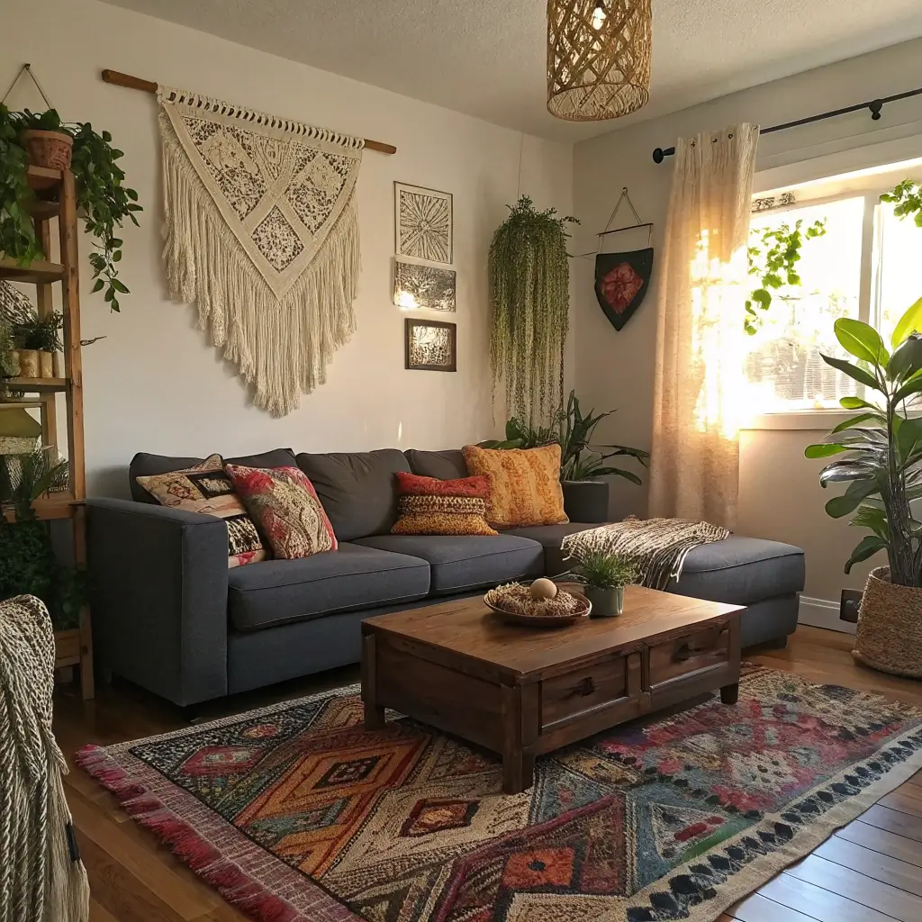 - Macramé Wall Hangings: A large woven piece above the couch adds height and softness to the room.