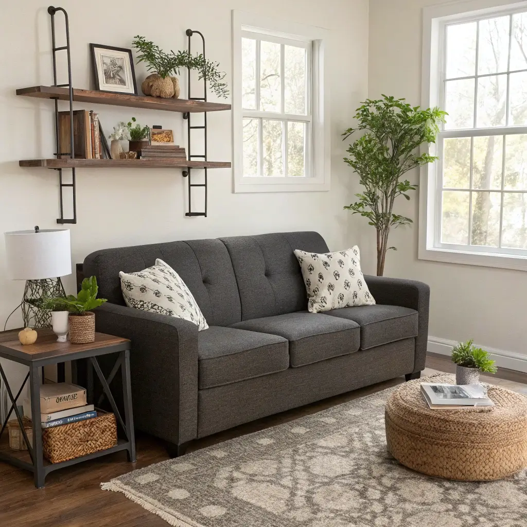 When you use a dark anchor like a charcoal sofa in a small space, it creates a sense of depth. Position the couch against the longest wall to maximize floor space.