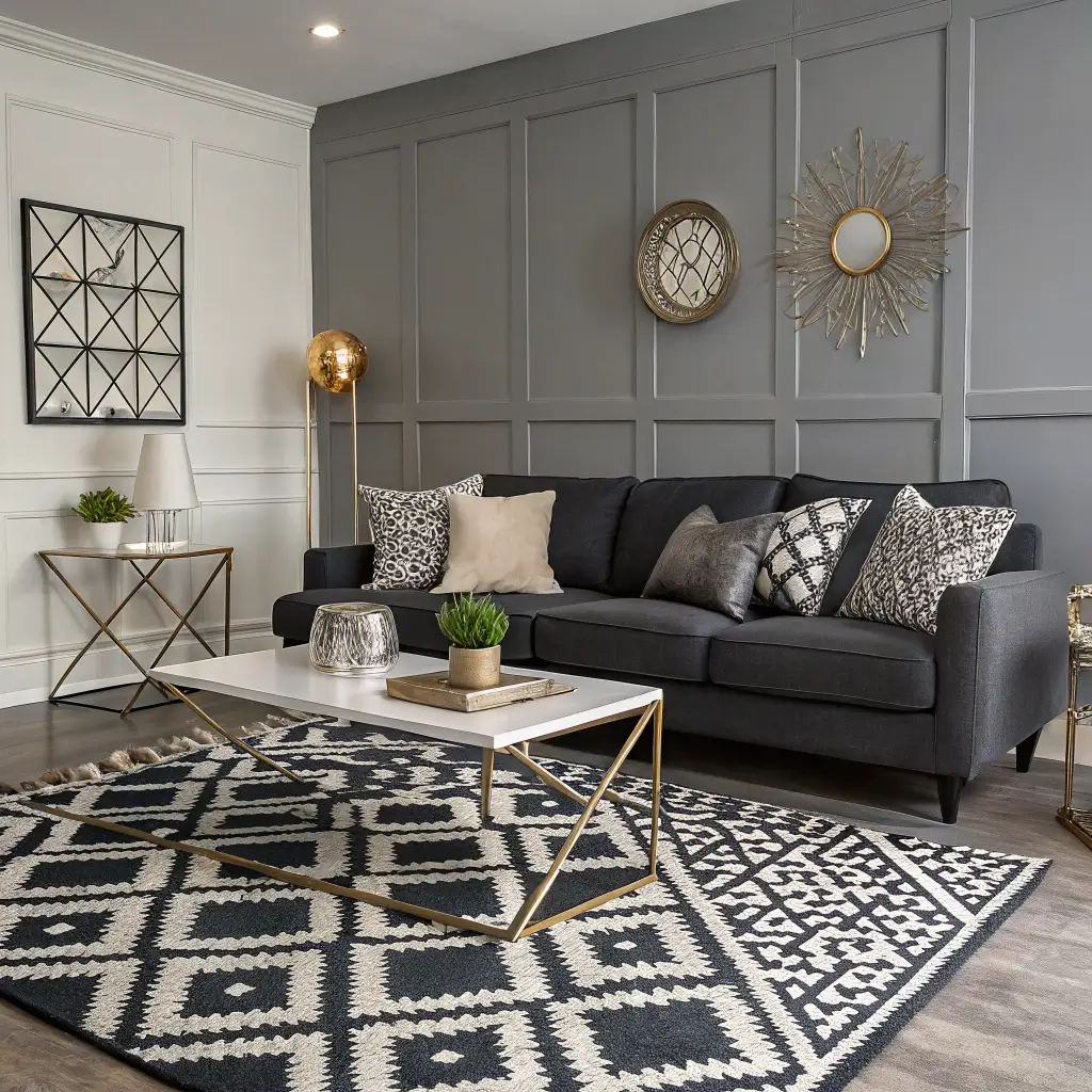 - Faux Fur: A white or light grey faux fur rug draped over the arm of the couch is the ultimate glam move.