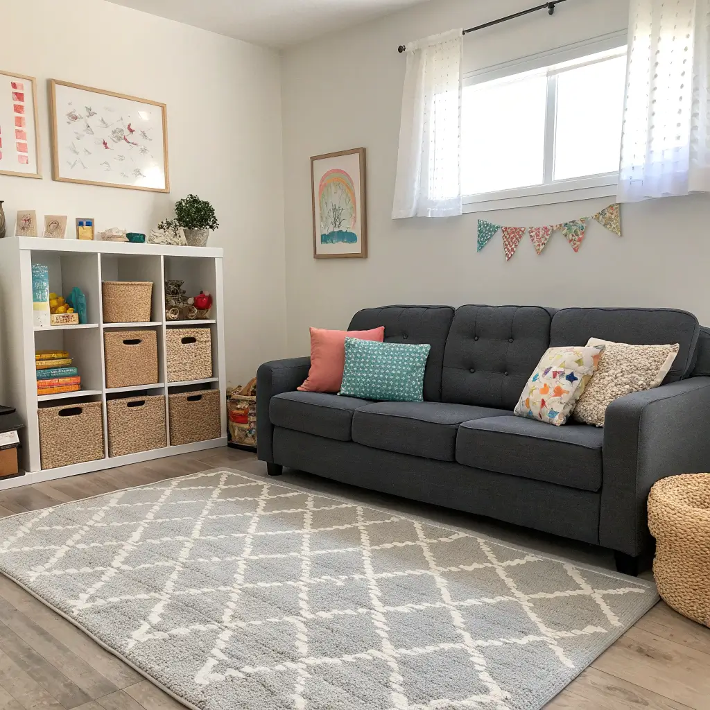 - Storage Ottomans: Instead of a coffee table with sharp corners (dangerous for toddlers!), use a large charcoal ottoman. It doubles as extra seating and a safe place for kids to play.