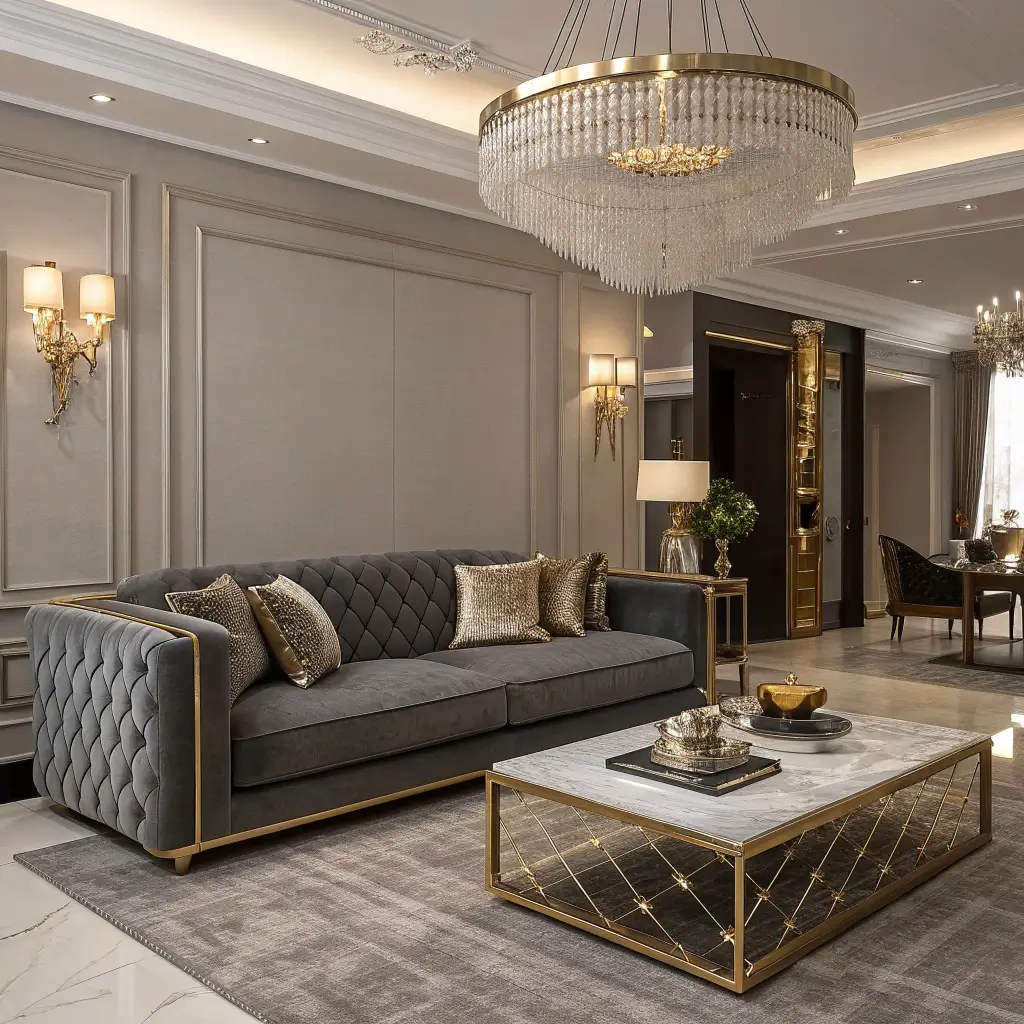 - Silver or Pewter Accents: Provides a metallic “glint” that breaks up the matte fabric of the sofa.