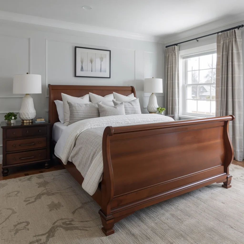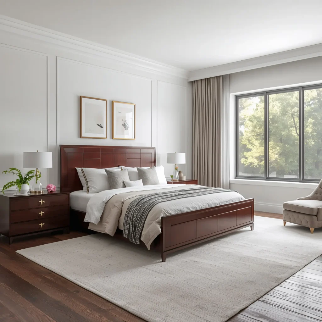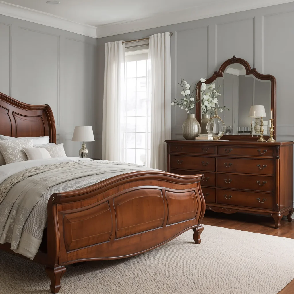 The trick here? Balance the richness of cherry wood with lighter elements. Choose cherry wood furniture with elegant details – maybe carved headboards or turned legs. Then brighten everything up with crisp white linens, light gray walls, and metallic accents in gold or rose gold.