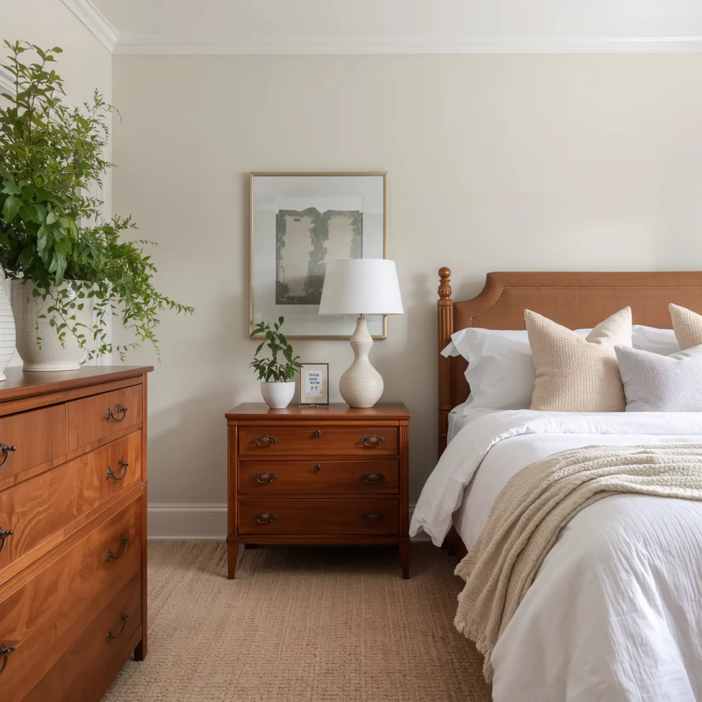 Work with beiges, taupes, warm grays, and creams. These colors complement cherry wood’s undertones without competing. I painted my bedroom walls this gorgeous greige (gray-beige, for the uninitiated), and my cherry wood furniture looks sophisticated AF against it.