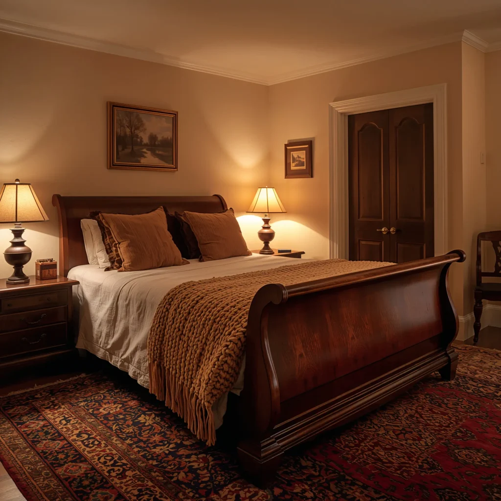 Don’t forget the lighting! Warm, dimmable bulbs are essential. Place table lamps on cherry wood nightstands, and maybe add some string lights for that extra cozy glow. Cherry wood naturally creates warmth, so lean into it with deep burgundies, burnt oranges, and rich creams.
