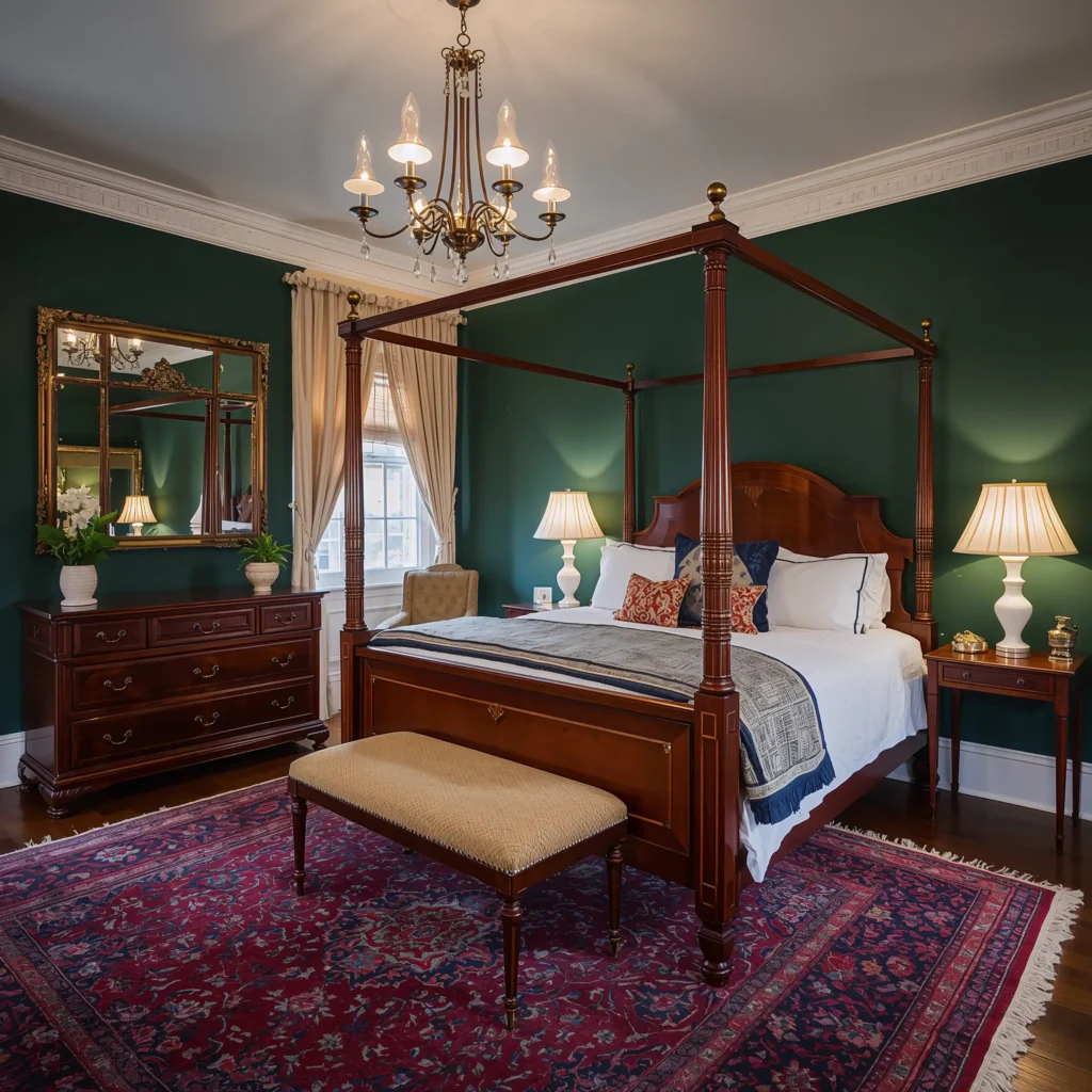The lighting here needs to be perfect. Layer ambient, task, and accent lighting. A stunning chandelier, reading sconces by the bed, maybe some picture lights for artwork. Your cherry wood furniture will look gallery-worthy under the right lights.