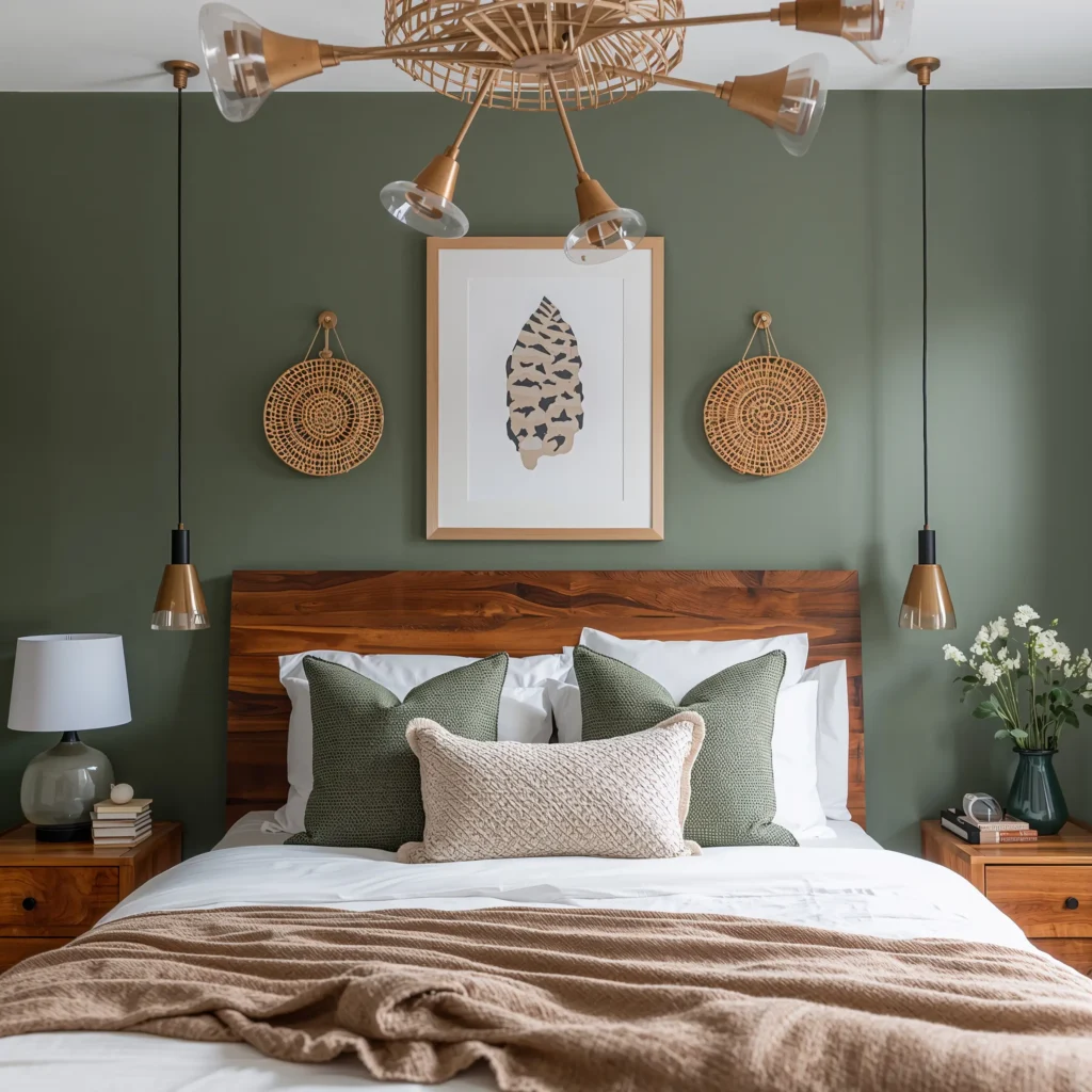 Mix in natural elements like rattan, bamboo, and plenty of plants. Hanging planters in macramé holders, a fiddle leaf fig in the corner, succulents on your cherry wood nightstand – greenery softens the wood’s formality. String up some warm fairy lights, add some tapestries, and you’ve got yourself a boho paradise.