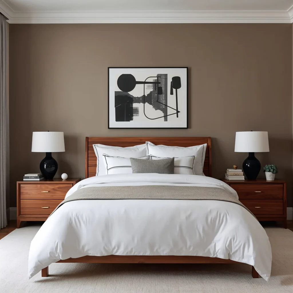Add sophisticated touches like a cherry wood-framed statement mirror, matching lamps with silk shades, or a plush bench at the foot of the bed. Think about symmetry – matching nightstands, balanced artwork, coordinated window treatments. Everything should feel intentional and polished.