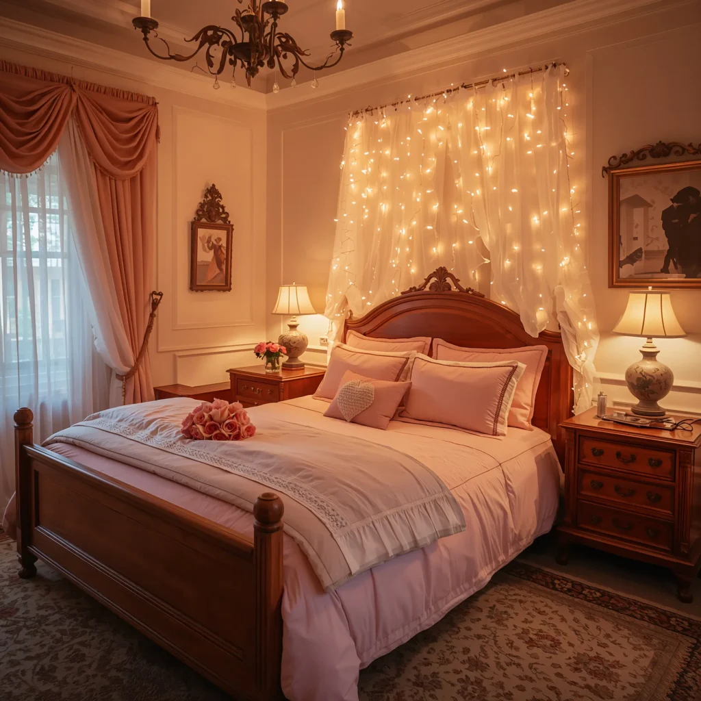 Layer in romantic colors: dusty rose, soft lavender, champagne gold. Sheer canopy draping, silk pillows, maybe some vintage lace accents. Dimmable lighting is non-negotiable – you want options from bright-enough-to-read to mood-lighting-central. And obviously, candles. Lots of candles.
