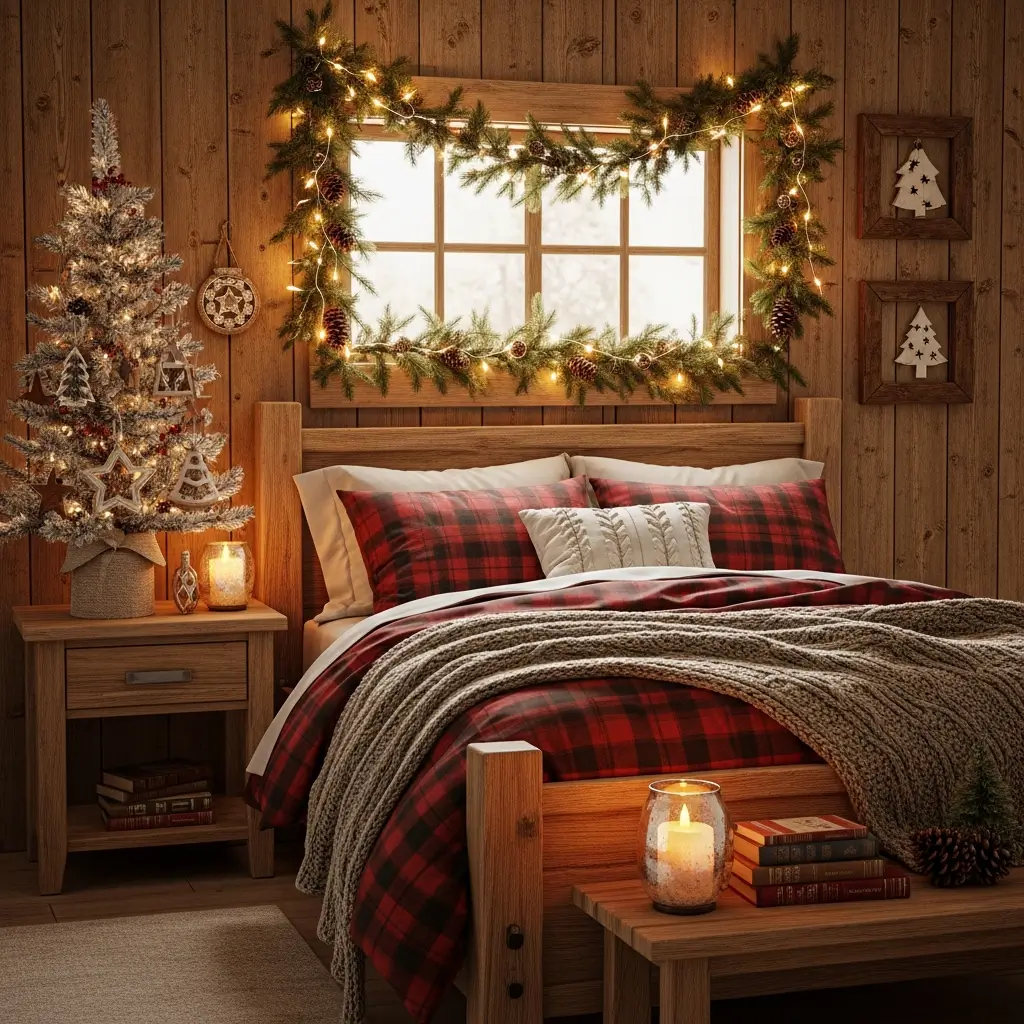 Incorporate real or high-quality faux greenery everywhere. Drape garland across your headboard, place mini pine trees on nightstands, and add pine cone accents throughout. Use warm wood tones in your decor – think rustic picture frames, wooden signs, and natural branch arrangements.