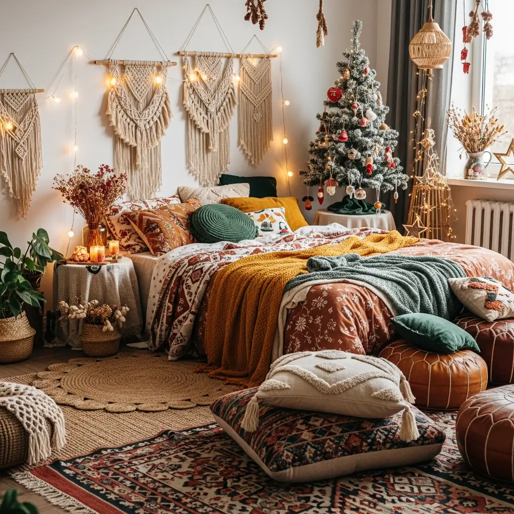 Mix free-spirited bohemian style with Christmas magic for an aesthetic that’s uniquely unconventional. This approach breaks traditional holiday rules while still feeling festive.