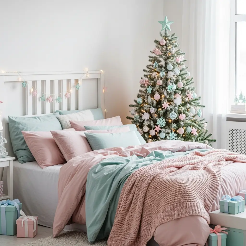 Include soft textures like velvet, faux fur, and knit in your pastel palette. Add white or cream lights for warmth. The overall effect should feel like a winter fairy tale, not a nursery.