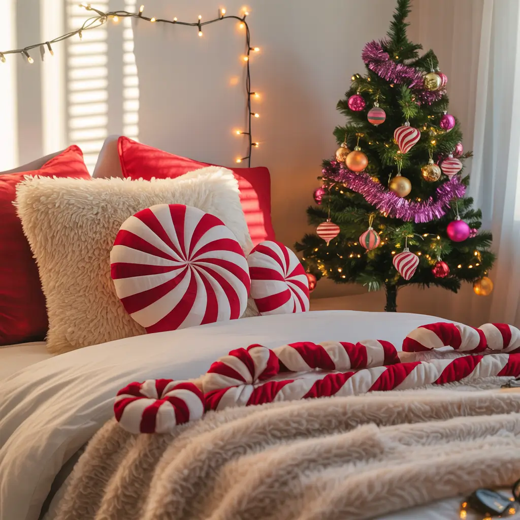 Red and white stripes everywhere – but strategically. Use candy cane colors in bedding, pillows, or curtains without going full peppermint explosion. Balance sweet elements with sophisticated touches.