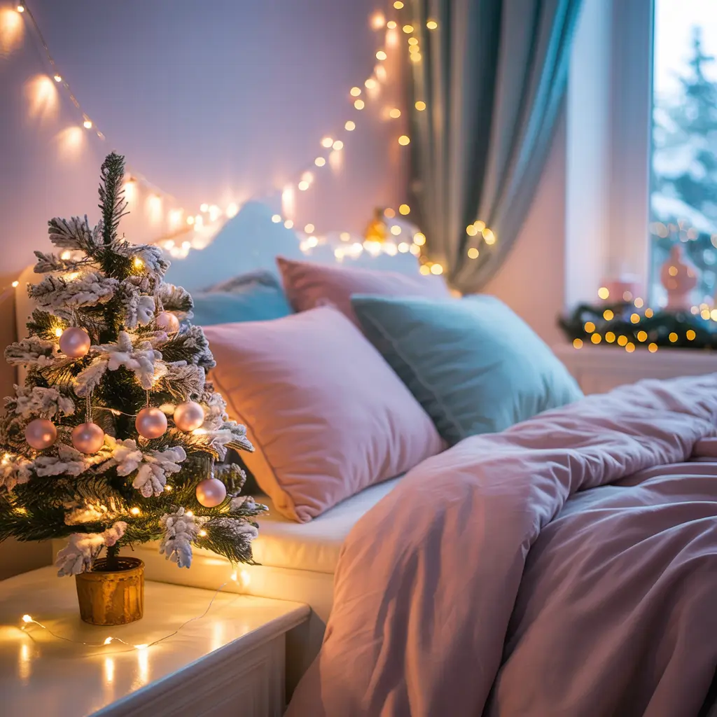 Use pastel bedding with subtle holiday patterns. Add a small flocked tree with pastel ornaments. String lights in soft pink or blue create magical ambiance without harsh brightness.