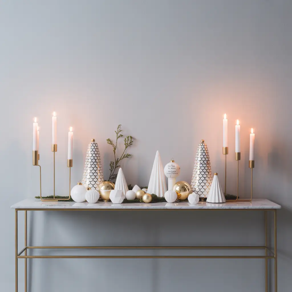 Choose 3-5 statement pieces max. Each item should earn its spot through beauty, function, or both. I typically go with two tall white candlesticks with gold-tipped candles on one side, balanced by a single white ceramic tree or modern sculpture on the other.