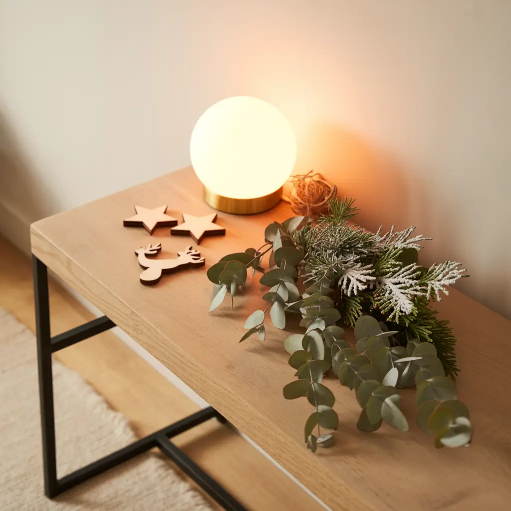Add a sparse arrangement of eucalyptus in a white or gold vase. Keep it simple – we’re not creating a full bouquet here. A few strategic branches provide organic texture without chaos.