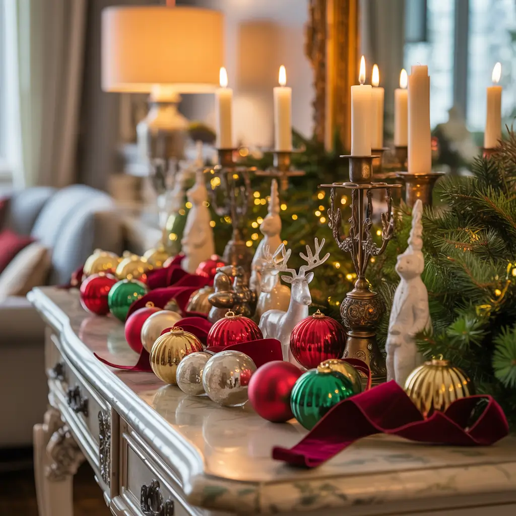 Add brass candlesticks with red taper candles for height and drama. Include one statement piece – maybe a beautiful nutcracker or elegant Santa figure. The goal is refined traditional, not grandma’s attic explosion.