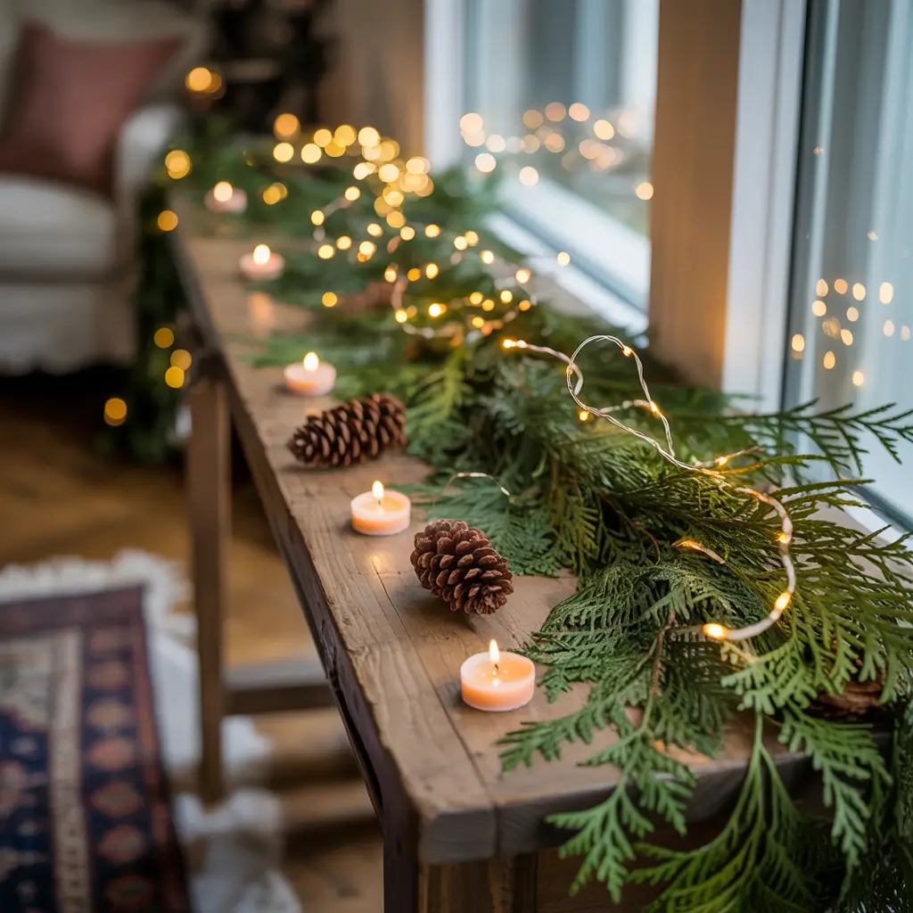 String white fairy lights throughout the arrangement. Let some cascade down the front of the console for extra magic. The key is making it look naturally snow-dusted, not like you attacked everything with spray snow (been there, regretted that).