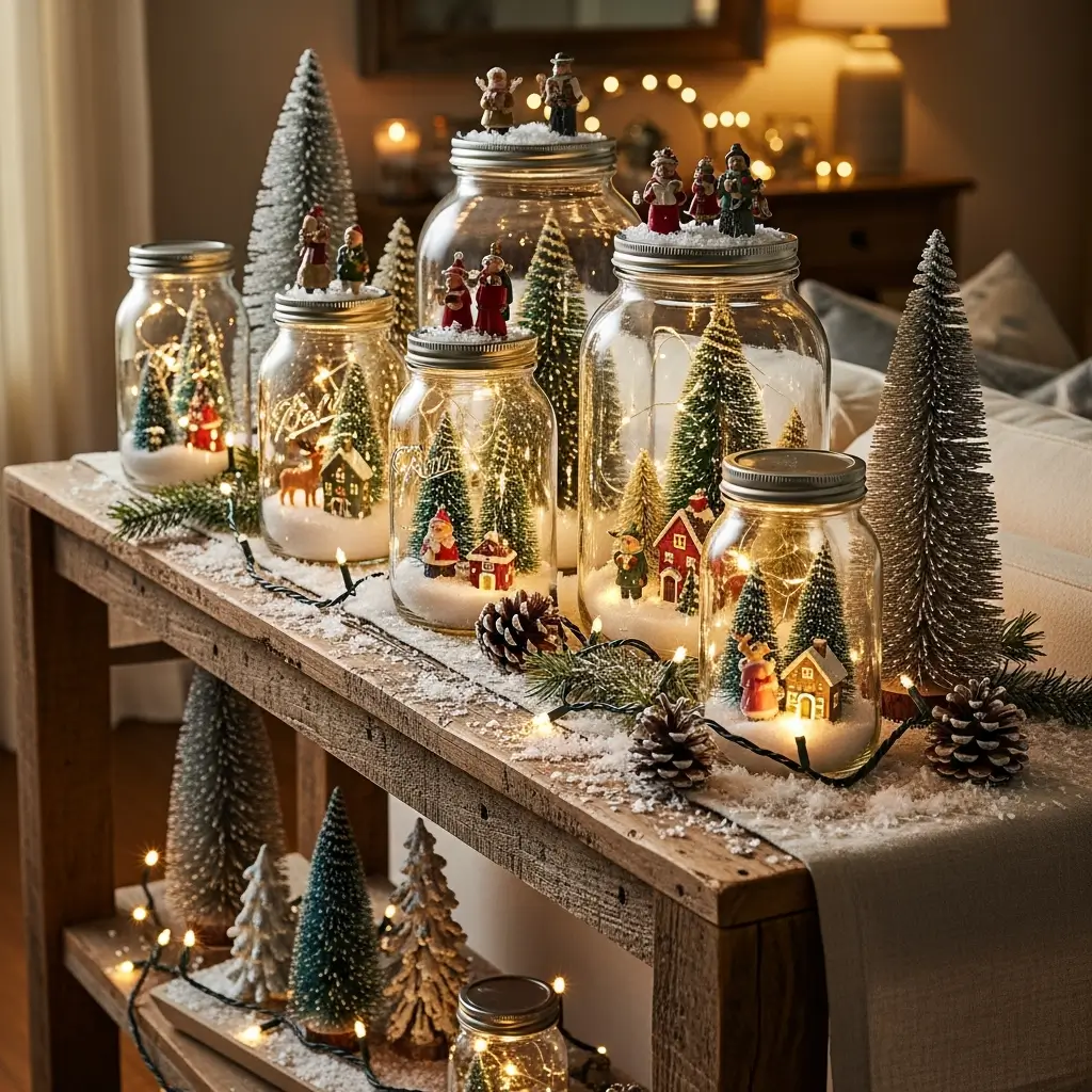 Create scenes inside each jar – a jar with a few trees, another with a small house, one with a snowman figure. Add a layer of fake snow at the bottom using Epsom salt or craft snow.
