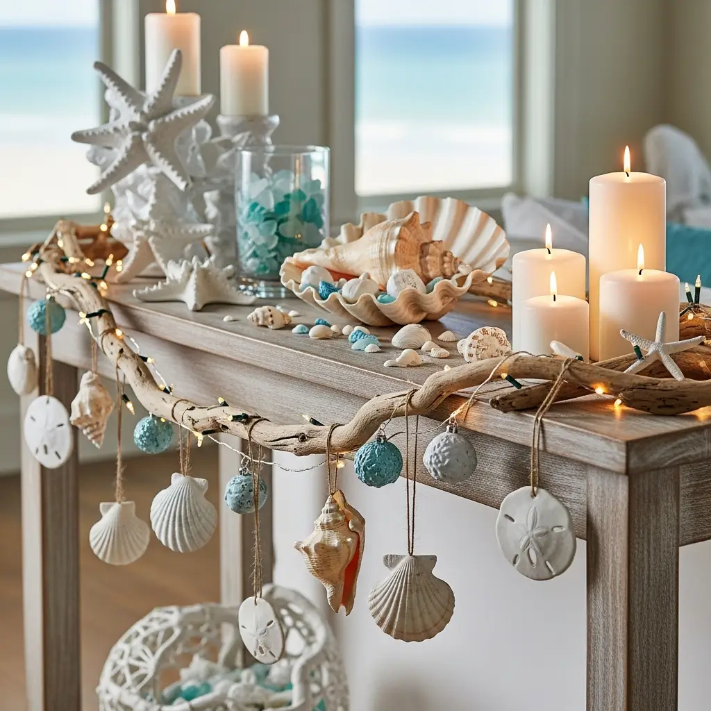 Include subtle nods to Christmas – maybe bottle brush trees spray-painted white or soft blue, ornaments in coastal colors, or a “Merry Christmas” sign in weathered wood finish.