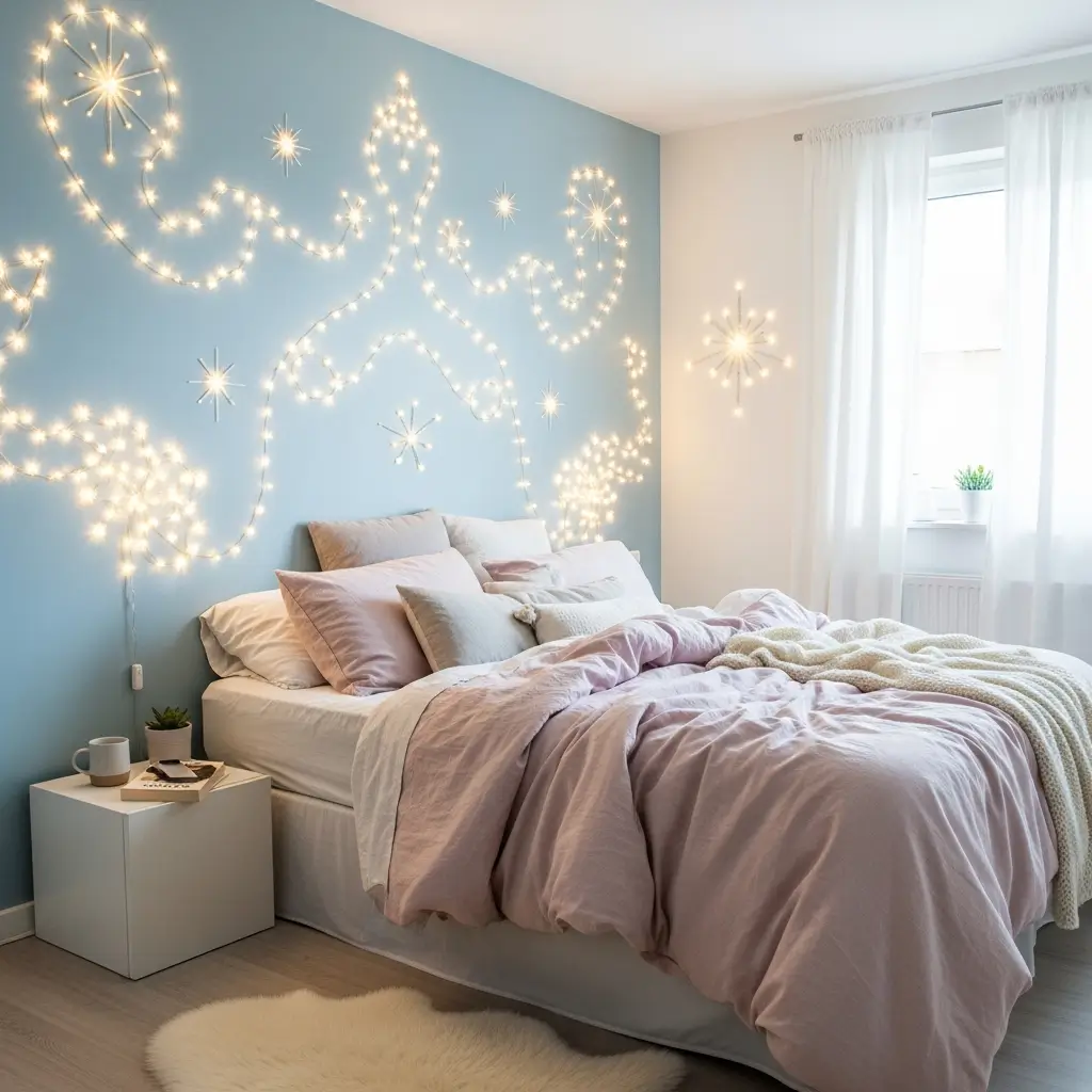 Start simple with geometric shapes if you’re not artistically inclined. Triangles, zigzags, or waves look intentional and modern. Create a faux headboard using lights if you don’t have one – just outline where a headboard would go.