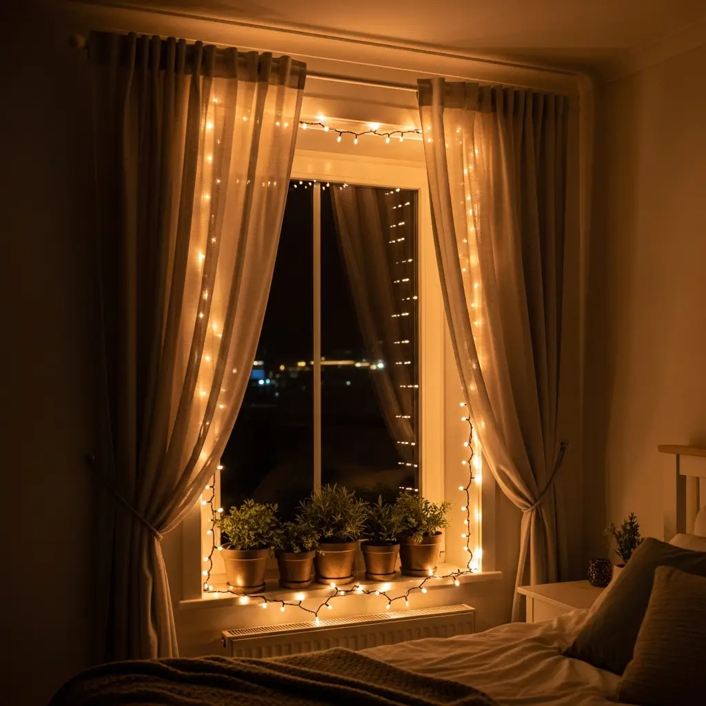 My bedroom window faces a boring brick wall, but adding window lights transformed it into something magical. The reflection in the glass at night doubles the light effect, making my small bedroom feel twice as bright and spacious.
