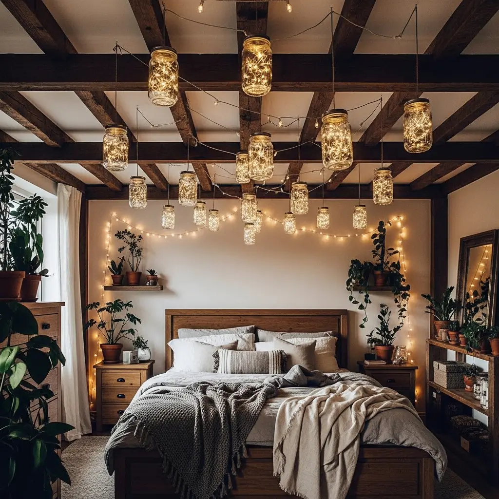 Fill mason jars with battery-operated fairy lights, leaving some lights trailing out the top. Wrap wire around the jar rim to create hanging loops, then suspend them at varying heights from ceiling hooks or a curtain rod.