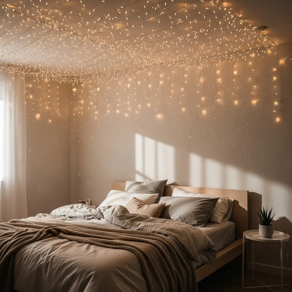 Create swags by letting lights drape slightly between attachment points. This softer look feels more organic than rigid straight lines. Add sheer curtains behind the lights to diffuse the glow throughout your room.