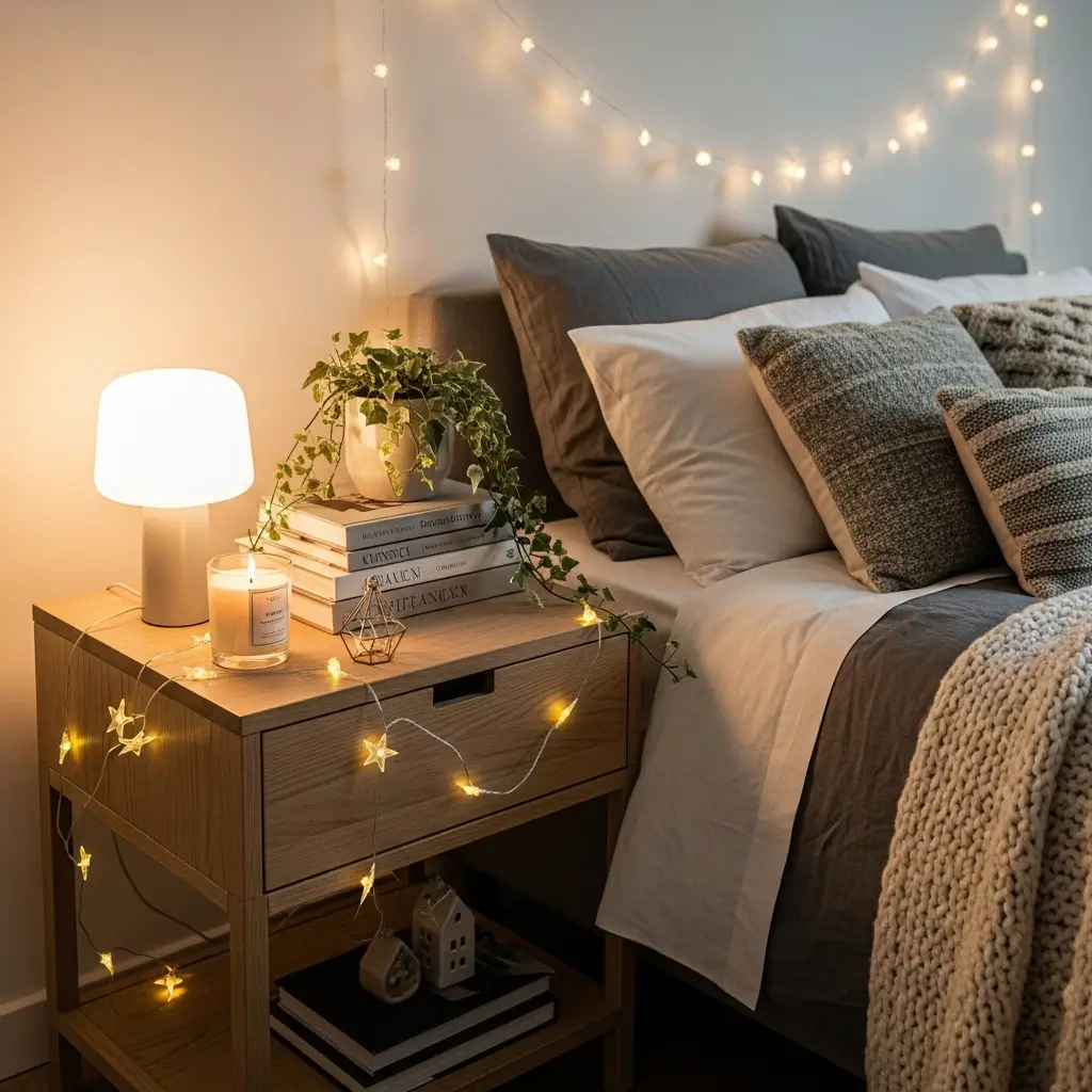Drape garland-style lights along your nightstand, letting them pool slightly on the surface. Weave them through bedside accessories like picture frames, books, or small plants. The organic placement feels effortless and intentional.