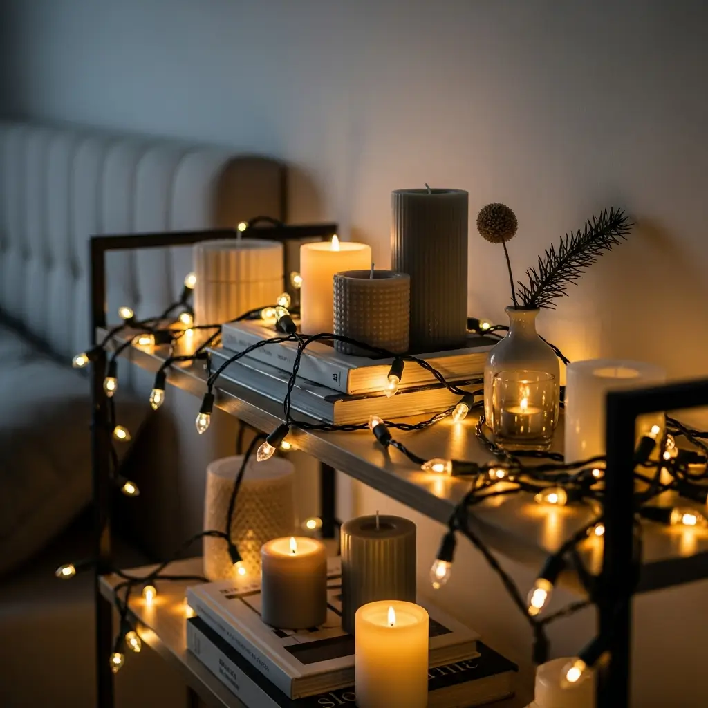 Layer lights with other textures – mix smooth glass, rough wood, and soft fabrics. Use battery-operated lights in glass containers for portable ambiance you can move as needed.