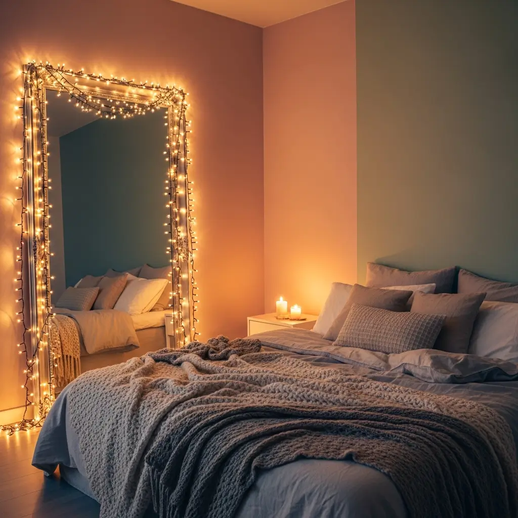 Mirrors and Christmas lights together create infinite sparkle and the illusion of twice as many lights. This trick makes small bedrooms feel massive and dark rooms feel bright.