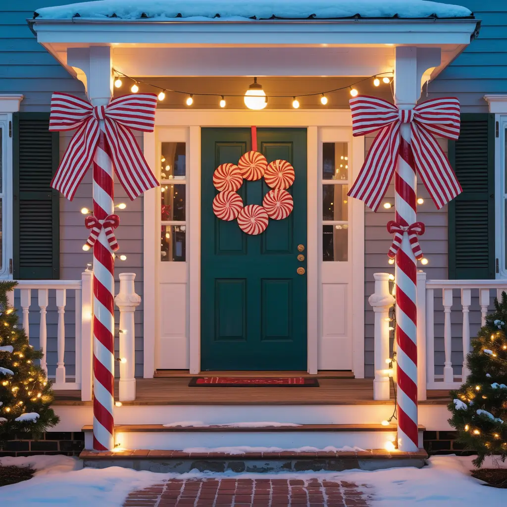 Line your walkway with candy cane lights or DIY versions made from PVC pipe and red tape. Hang oversized candy decorations from the porch ceiling, and don’t forget the peppermint scent spray. Yes, that’s a thing, and yes, it’s amazing.
